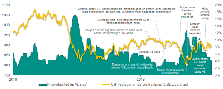 Op de korte termijn blijft het handelsconflict de prijs beïnvloeden. De onzekerheid over de Chinese vraag naar sojabonen blijft hoog. Door de Afrikaanse varkenspest kopen varkensboeren in China mondiaal minder sojabonen. Dat treft in eerste instantie vooral de export vanuit Latijns-Amerika. Komend seizoen groeit de mondiale vraag naar sojabonen volgens de International Grains Counsil (IGC) in totaal met 2%. De totale productie krimpt echter met bijna 4%. De voorraden dalen daardoor tot 13% van de totale consumptie, ofwel 6-7 weken beschikbare consumptie. In dit scenario is de prijs van sojabonen in staat om te herstellen in het seizoen 2019/20.