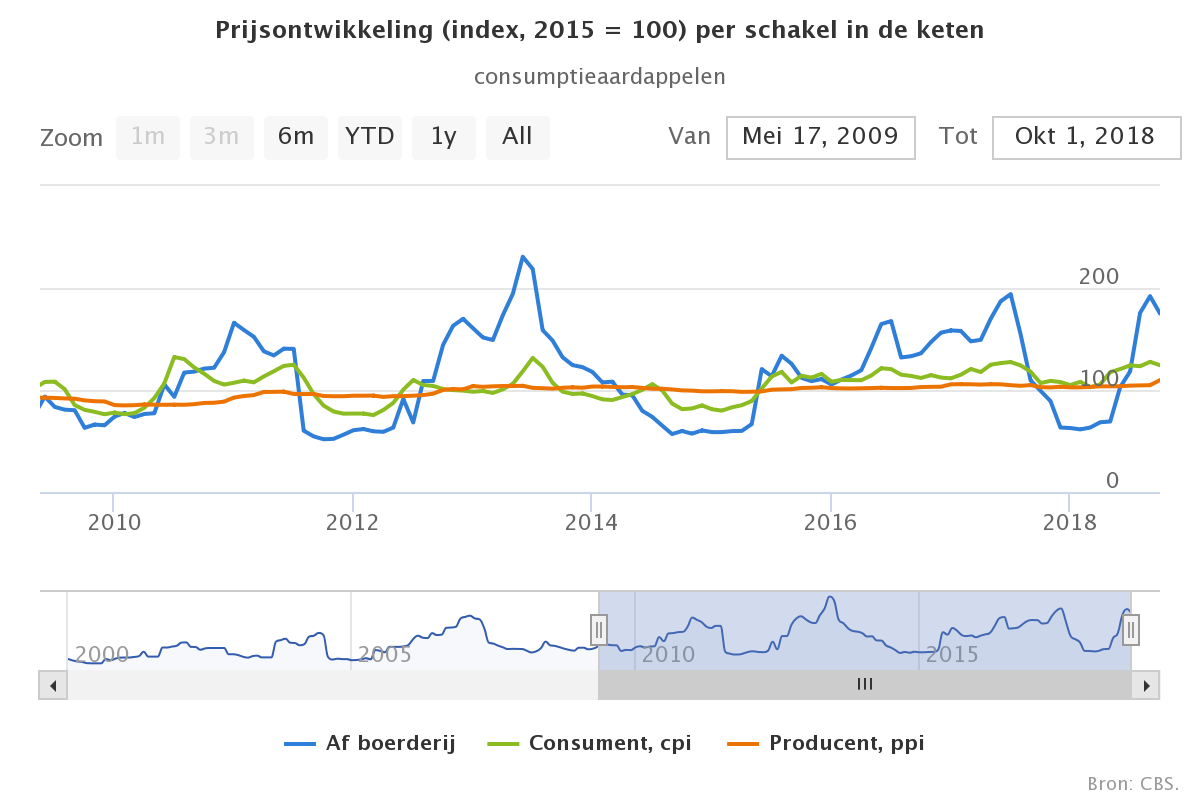 In oktober is de consumentenprijsindex uitgekomen op 124 punten, 16% hoger dan oktober vorig jaar. Verwacht wordt dat die prijs door de geringe oogst dit seizoen op een hoog niveau blijft. De aardappelprijs af boerderij is in het begin van het nieuwe seizoen in augustus fors hoger dan in augustus 2017: 176 in 2018 tegen 155 in 2017 (2015=100). Door de krappe oogst in Noordwest-Europa is de index in september nog verder opgelopen tot 192, maar in oktober gedaald naar 175. De oogst is dit jaar extreem laag, omdat de aardappelen relatief laat geplant zijn en er plaatselijk in het voorseizoen te veel neerslag viel en de zomerperiode bovendien extreem heet en droog was.