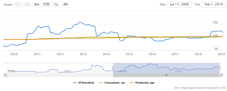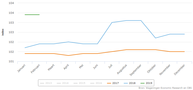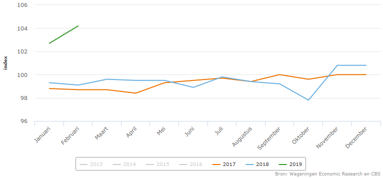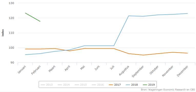 Deze prijzen zijn weinig afhankelijk van de actuele ontwikkelingen op de wereldtarwemarkt, omdat de prijsrisico’s en grondstofvoorziening veelal worden afgedekt door contracten. Door de lagere tarweoogsten wereldwijd in 2018 is de prijsindex af boerderij sinds juli 2018 opgelopen tot 118 punten in februari, 23% hoger dan een jaar eerder.