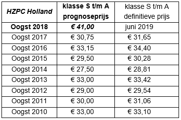 Pootaardappelhandelaar HZPC Holland B.V. heeft de prognoseprijs voor oogst 2018 vastgesteld en verwacht haar Nederlandse pootgoedtelers de recordprijs van € 41,- per 100 kilo te betalen. Tot op heden was oogst 2007 het jaar met de hoogste uitbetalingsprijs van € 36,50 per 100 kilo.