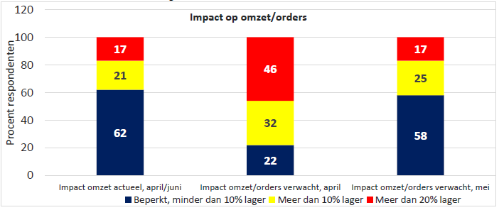 42% van de ondervraagden verwacht de komende 3 maanden een omzetdaling van meer dan 10%. Dit is overigens minder pessimistisch dan 2 maanden geleden; toen verwachtte 76% een omzet- en order-daling van meer dan 10%.