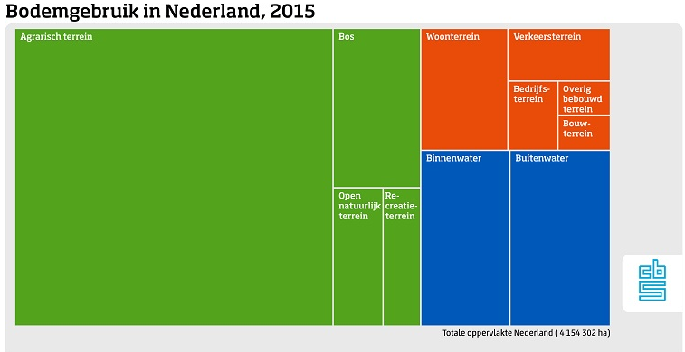 Met behulp van luchtfoto’s, kaartmateriaal en andere bronnen wordt het functionele bodemgebruik van Nederland elke twee tot drie jaar in kaart gebracht. In 2015 was ruim twee derde van de oppervlakte in gebruik als groene ruimte (68 procent), waarvan het merendeel als agrarisch terrein (54 procent van het totaal). Bos, open natuurlijk terrein en recreatieterrein vormen de rest van het groene areaal. Nederland bestaat verder voor 19 procent uit water en voor 13 procent uit bebouwd gebied, zoals woon- en bedrijfsterrein.