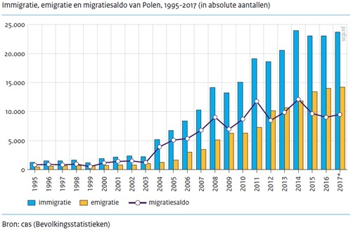 Ondanks de economische crisis schommelen de aantallen Polen die naar Nederland komen de afgelopen jaren rond de 23 duizend per jaar. De jaarlijkse instroom van Polen is groter dan die van de vier klassieke herkomstgroepen samen (Turken, Marokkanen, Surinamers en Antillianen). In de periode 2012-2016 kwamen er jaarlijks gemiddeld iets minder dan 5 duizend Bulgaren en bijna 4 duizend Roemenen naar Nederland, elk minder dan een kwart van de Poolse instroom. De emigratie van Polen is de laatste jaren ook sterk toegenomen. Ruim de helft van de Poolse immigranten die in het eerste decennium van deze eeuw naar Nederland zijn gemigreerd (en in het bevolkingsregister geregistreerd stond), is inmiddels weer vertrokken. Per saldo komen er sinds 2007 jaarlijks ongeveer 10 duizend Polen bij in Nederland. De laatste jaren neemt het saldo wat af vanwege een oplopend vertrek uit Nederland.