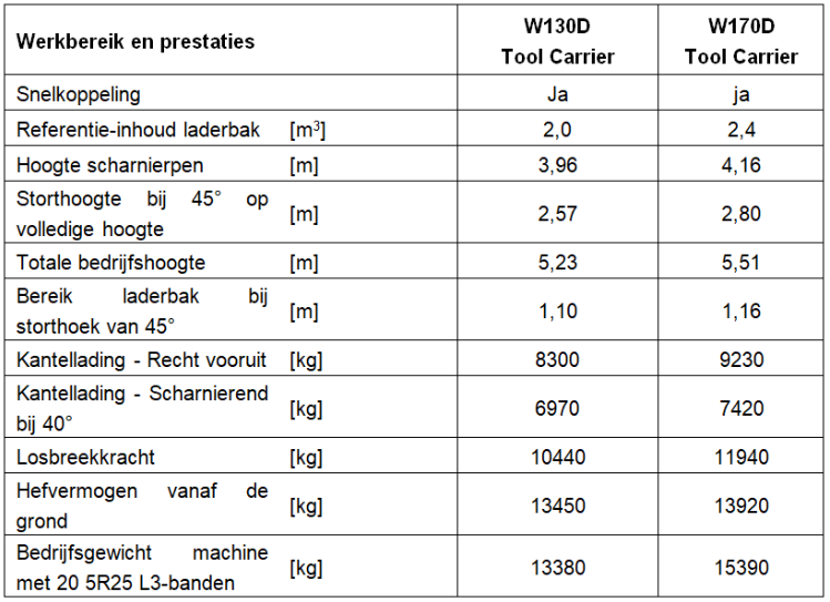 De W170D en W130D zijn nu verkrijgbaar met Tool Carrier hefarm met parallelle giek die een hoog hefvermogen combineert met zelfnivellerende kinematica, voor hoge laadprestaties en uitstekende parallelle bewegingen gedurende de gehele hefbeweging. Dankzij superieur zicht op de snelkoppelingen kunnen werktuigen snel en veilig worden verwisseld, waardoor er uitstekend mee kan worden gemultitaskt, wat ideaal is voor veehouderijen, gemengde boerderijen, producenten van handelsgewassen en biogasbedrijven.