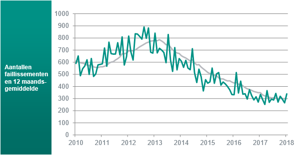 Het aantal faillissementen is tot en met oktober met 8% afgenomen ten opzichte van dezelfde periode vorig jaar. Door de daling van het aantal faillissementen aan de ene kant en de stijging van het aantal bedrijven aan de andere kant is de faillissementsgraad in de meeste sectoren nog erg laag. De daling van het aantal faillissementen lijkt echter in de laatste maanden van dit jaar te zijn gestabiliseerd. ABN AMRO verwacht hierom geen verdere daling van het aantal faillissementen, maar een lichte stijging van tussen de 0% en 5%.