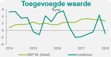 De toegevoegde waarde (tegen vaste prijzen) van de agrarische sector kende eind 2017 een opleving, maar daalde begin 2018 weer. Deze daling kwam voornamelijk door lagere volumes. De prijzen zijn wel flink gestegen.