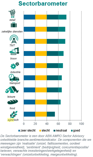 Hoewel de groei van het bruto binnenlands product (bbp) is afgezwakt, blijft het economisch sentiment in de diverse sectoren van de Nederlandse economie positief. Uit de Sectorbarometer van ABN AMRO blijkt dat met name de retailsector, de zakelijke dienstverlening en technologie, media en telecom (TMT) in goede conditie verkeren.