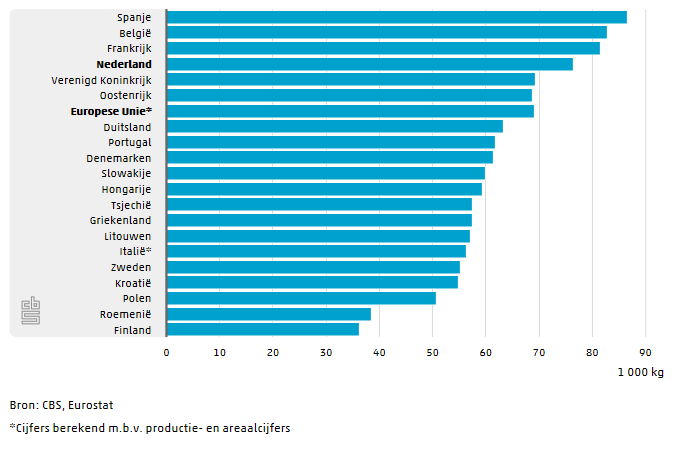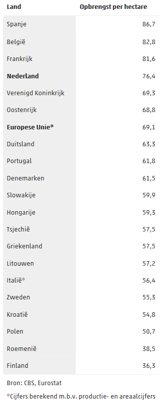 In vrijwel alle 28 EU-landen werden in 2018 minder suikerbieten per hectare geoogst. In de Europese Unie werd er gemiddeld 69,1 duizend kilo per hectare geoogst, 15,2 procent minder dan in 2017. Spanje was het EU-land dat het beste resultaat noteerde. In dat land werd er vorig jaar gemiddeld bijna 87 ton (-3,5 procent) aan suikerbieten van een hectare grond gehaald. Nederland deed het met 76,4 ton per hectare beter dan de meeste landen van Europa, de opbrengst was wel 18 procent lager die van 2017.
