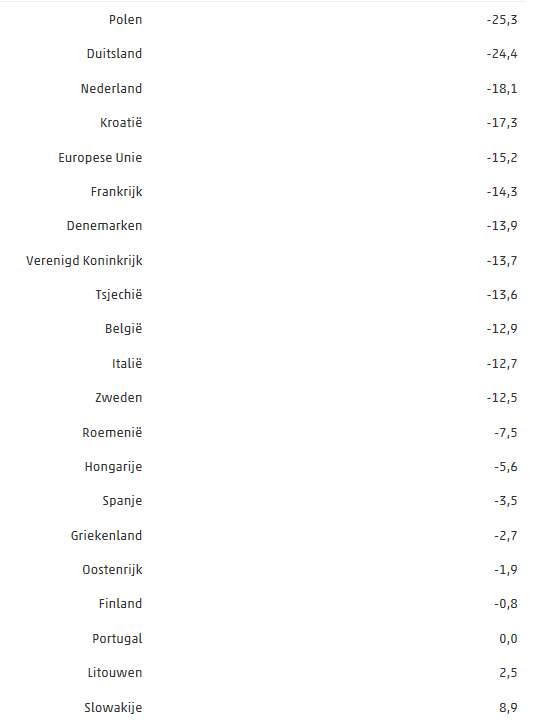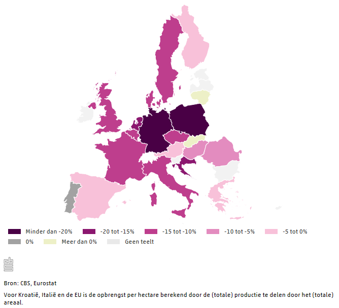 De Poolse en de Duitse akkerbouwers boekten met een oogst van 50,7 duizend, respectievelijk 63,3 duizend kilo per hectare vergeleken met hun Europese collega’s het slechtste resultaat (beide zo’n 25 procent minder dan in 2017). In landen als Spanje (-3,5 procent) en Griekenland (-2,7 procent) viel de opbrengstdaling mee.