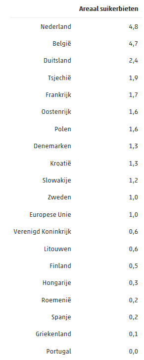 Nederland kende in 2017 relatief het grootste areaal suikerbieten in de EU. Op bijna 5 procent van het totale landbouwareaal in ons land werden suikerbieten geteeld. Het relatieve belang van suikerbieten is dus voor de Nederlandse landbouw groter dan in de andere EU-landen. Gemiddeld werd er in de EU (exclusief Italië) op 1 procent van het totale landbouwareaal aan suikerbietenteelt gedaan. De belangrijke Europese suikerbietenlanden Duitsland en Frankrijk zaten op respectievelijk 2,4 en 1,7 procent. In Spanje werd slechts 0,2 procent van het totale landbouwareaal bebouwd met suikerbieten.