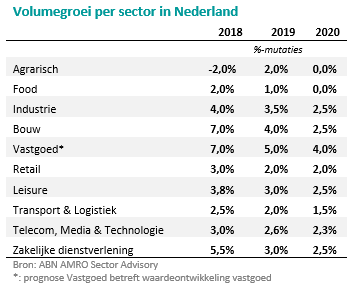 Eerst het goede nieuws: de economie draait op volle kracht en alle sectoren laten de komende twee jaar een gezonde groei zien, zo blijkt uit de berekeningen van de sectoreconomen van ABN AMRO. De groeipercentages van 2% tot in enkele gevallen zelfs 3% of 4% per sector geven reden tot optimisme. De agrarische sector doet het volgend jaar zelfs beter dan verwacht, net als de industrie en de retail. In 2020 groeien de meeste sectoren naar verwachting door.