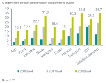 Dan de kanttekening: de groei wordt geremd, waardoor de sectoren, evenals het bruto binnenlands product (bbp), in 2019 minder hard groeien dan in 2018. De begrotingsperikelen in Italië, de chaotische Brexit en de handelsoorlog tussen China en de VS voeden de onzekerheid. Dichterbij huis gooit de krapte op de arbeidsmarkt, die inmiddels chronische vormen lijkt aan te nemen, extra olie op het vuur. Het aantal openstaande vacatures neemt kwartaal op kwartaal toe, zo blijkt uit cijfers van het Centraal Bureau voor de Statistiek (CBS). De schaarste aan specifieke beroepsgroepen neemt toe. Programmeurs krijgen elke maand verzoeken om elders aan de slag te gaan. Hoe minder snel die vacatures worden opgevuld, hoe meer pijn het gaat doen.