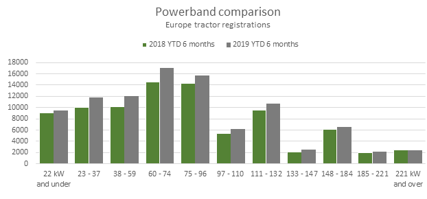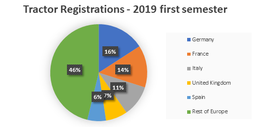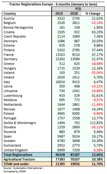 In totaal werden in de eerste zes maanden van 2019 ongeveer 96.428 tractoren in heel Europa geregistreerd, volgens cijfers van de nationale autoriteiten. Van deze registraties waren 21.285 trekkers 37 kW (50 pk) en minder, en 75.143 waren 38 kW en meer. CEMA is van mening dat 77.383 van deze voertuigen landbouwtrekkers zijn, de rest quads, verreikers of andere werktuigen.