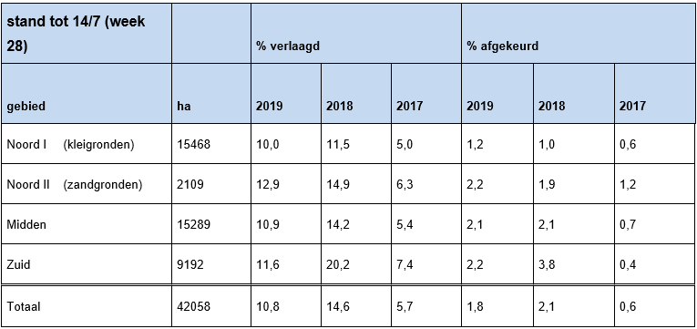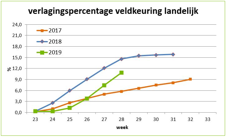 De tweede keuring is nu voor 90% afgerond en voor 2.873 percelen is inmiddels toestemming loofvernietiging aangevraagd. Het verlagingspercentage is in week 28 met ruim 3% toegenomen, waarmee het totale verlagingspercentage uitkomt op 10,8%.