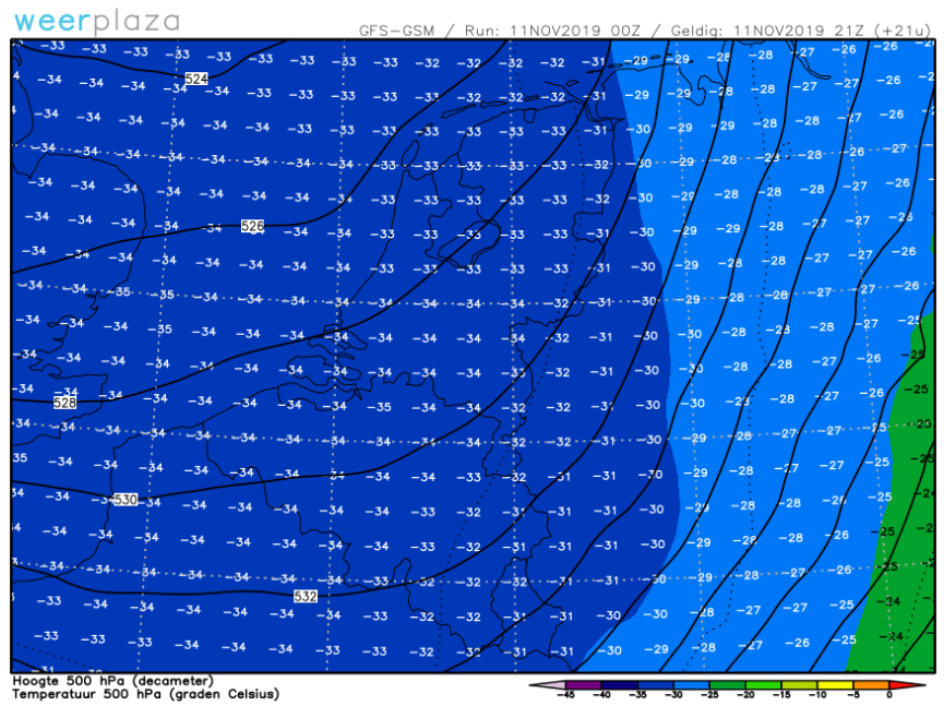 Achter het regengebied, dat vandaag, maandag 11 november, over ons land trekt, stroomt vooral op grotere hoogte extreem koude lucht uit over onze omgeving. Op ongeveer 5200 meter daalt het kwik naar ongeveer -34 graden. Met een zeewatertemperatuur van ongeveer 13 graden is het temperatuurcontrast dusdanig groot dat boven zee en in de kustregio's pittige buien kunnen vallen. Onweer is dan mogelijk en dankzij de koude lucht op grote hoogte behoort ook hagel tot de mogelijkheden.