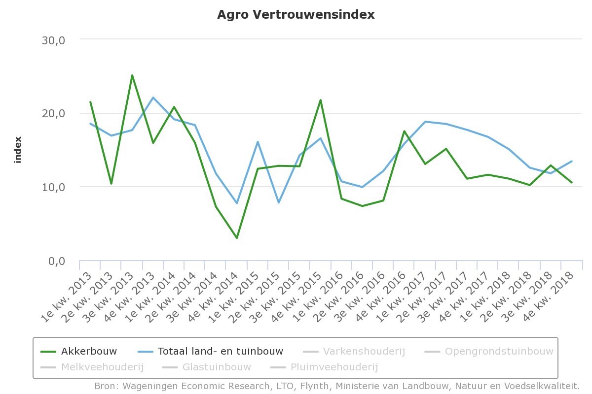 Het vertrouwen onder akkerbouwers is in het vierde kwartaal van 2018 met 2 punten gedaald. De huidige situatie, uitgedrukt in de stemmingsindex, veranderde nauwelijks (-0,6 punt) ten opzichte van een kwartaal gelden, terwijl de toekomstverwachting van de akkerbouwers een sterkere achteruitgang kende (-4 punten).