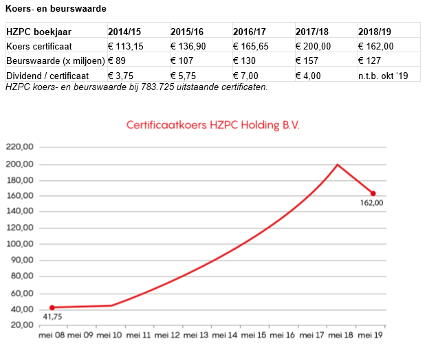 De koers van het certificaat van aandeel HZPC Holding B.V., dé wereldleider in aardappelveredeling, is na de halfjaarlijkse beursdag 10 mei 2019 vastgesteld op € 162,00 (gedaan, laten). Dit betekent dat het certificaat HZPC is gedaald met de maximale waarde van 10 %.
