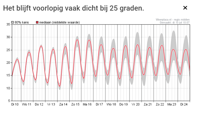 De 30-daagse voorspelling van Weerplaza gaf 4 weken geleden al aan dat het deze week 'te warm' zou worden. Houdt u van warm weer dan zit u deze week in ieder geval goed! Weerplaza geeft wel een eerlijke kanttekening bij de 30 daagse voorspelling. Tot nu toe scoorde de verwachting ongeveer de helft van de tijd goed voor 4 weken vooruit. Bij 3 weken vooruit kijken lopen de percentages al op naar 70% goed voorspelde weersverwachtingen.