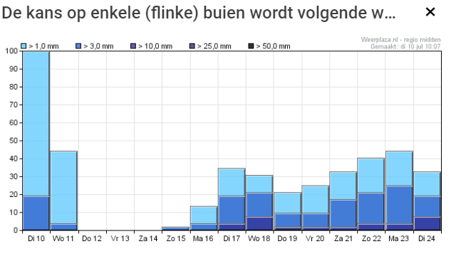 De laatste week van juli wordt ook berekend als een behoorlijk warme week. Deze week zullen er buien vallen maar ook deze buien zullen niet voorkomen dat we aan de droge kant blijven zitten. Ook voor de week erop is de kans op buien weer groot. De droogte zal daardoor naar alle waarschijnlijkheid niet gaan verergeren. Boven de Britse Eilanden ziet Weerplaza plekken met koel weer verschijnen. Dat wijst erop, dat de invloed van depressies groter wordt in het westen van Europa.