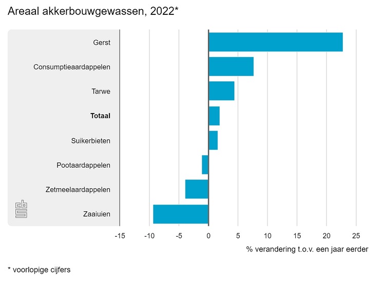 Het areaal akkerbouw is in 2022 met 10,5 duizend hectare, twee procent, toegenomen tot 536 duizend hectare. Gerst nam het meest toe, zaaiuien en zetmeelaardappelen worden in 2022 minder geteeld.