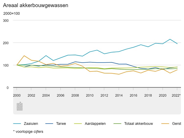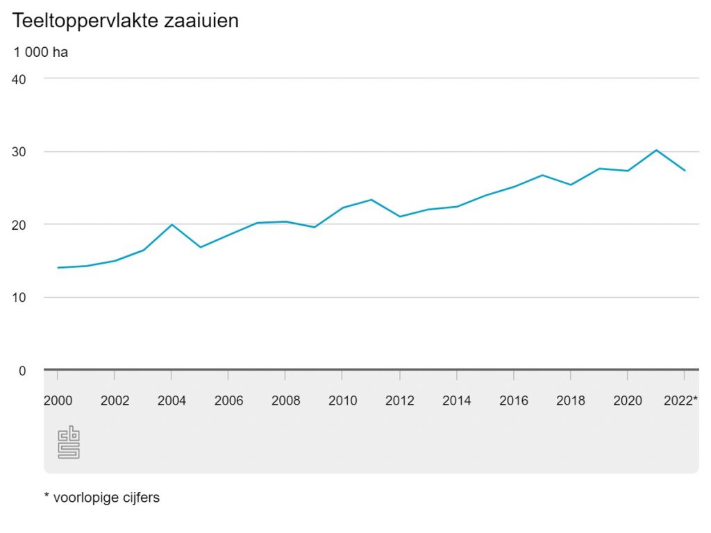 In 2022 besloeg het areaal zaaiuien 27,3 duizend hectare. Dat is 2,8 duizend hectare, oftewel 9,3 procent, minder dan een jaar eerder. Een jaar eerder nam de oppervlakte zaaiuien nog met 11,3 procent toe. Op een langere termijn heeft het areaal zaaiuien wel een groei doorgemaakt. Ten opzichte van het jaar 2000 is sprake van bijna een verdubbeling van het areaal zaaiuien in de akkerbouw.