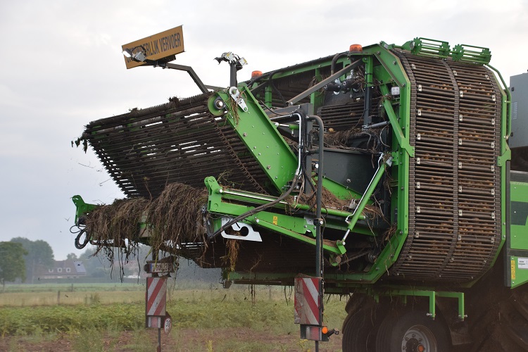 Vanaf de bestuurderstoel heb je vrij goed zicht op het rooiproces met de rooibek, de diabolo’s en het eerste gedeelte van de graafmat.