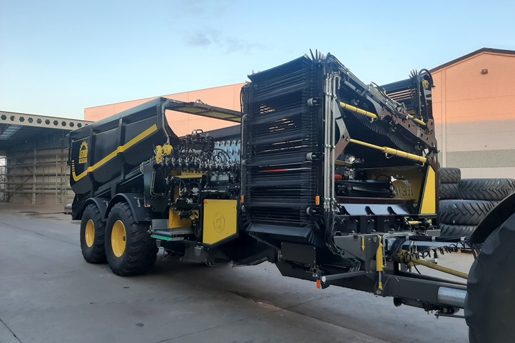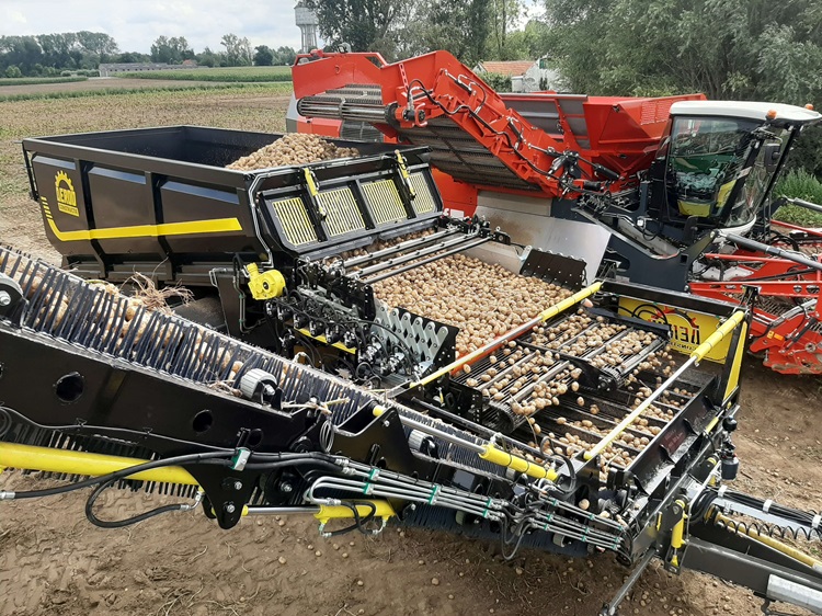 De overlaadwagen is uitgevoerd met een speciale reiniging. Uien, aardappelen en dergelijke kunnen schoon in de vrachtwagen of ander soort wagen worden gestort.