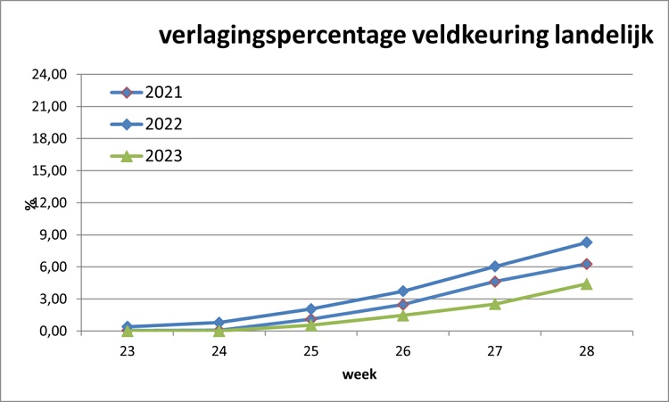 In de grafiek hieronder is het landelijke verlagingspercentage van de veldkeuring te zien in vergelijking met afgelopen jaren.