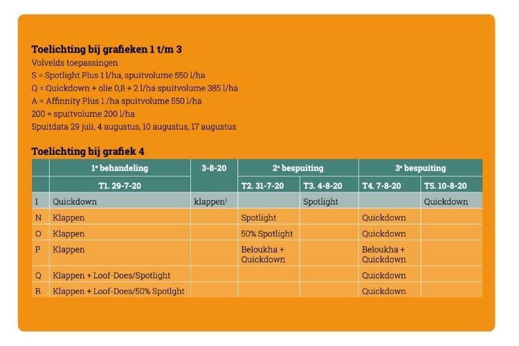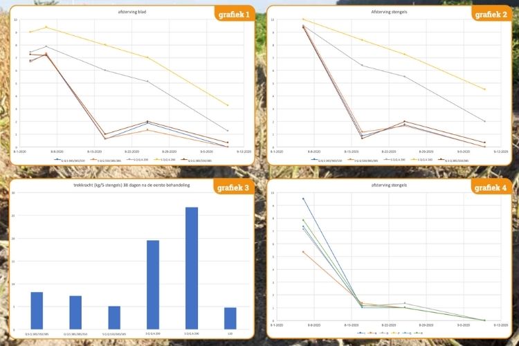 De resultaten van de proeven met loofdoding zijn gebundeld in een flyer waarvan de afbeeldingen op deze pagina zijn meegenomen. In de grafieken één en twee is weergegeven hoe snel het blad en de stengels afstierven bij verschillende volgorde van Spotlight en Quickdown en bij een verlaagd spuitvolume. Door middel van trekkracht werd bepaald hoe vast de stengels nog aan de knollen zaten vlak voor het rooien (grafiek 3). Met een nog niet toegelaten middel was de doding van het blad bijna even goed als met het niet meer toegelaten Reglone.