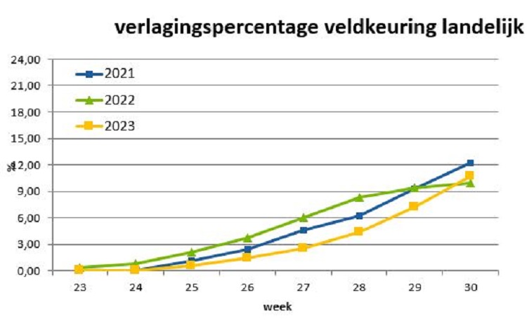 In de grafiek hieronder is het landelijke verlagingspercentage van de veldkeuring te zien in vergelijking met afgelopen jaren.