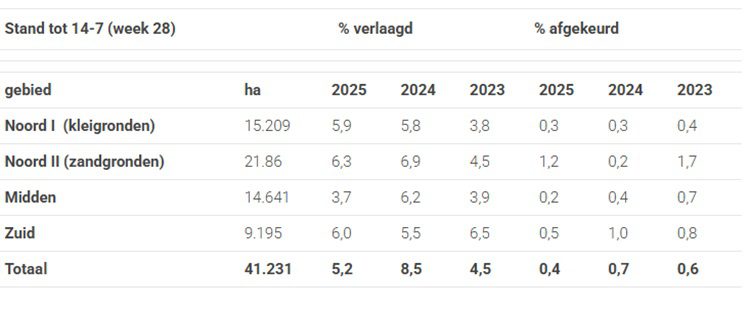 Daarnaast is voor twintig procent van het areaal loofvernietiging aangevraagd. Daarmee verloopt de veldkeuring dit seizoen heel voorspoedig.