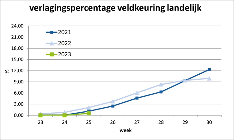In de grafiek hieronder is het landelijke verlagingspercentage van de veldkeuring te zien in vergelijking met afgelopen jaren.