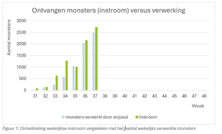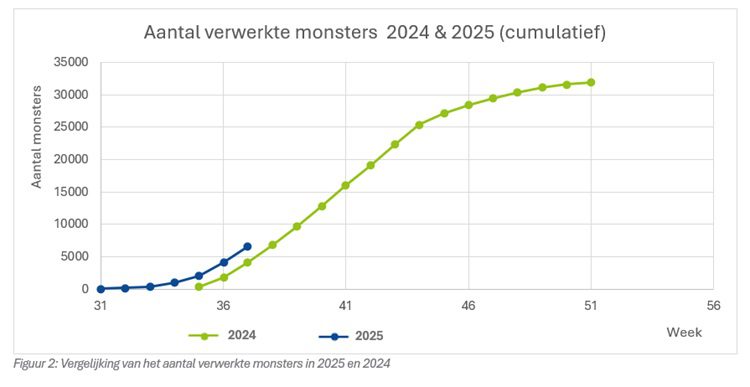 Een groot aantal percelen zijn gerooid, en de keurmeesters zijn volop bezig met het nemen van de monsters. Deze monsters verwerken we op het lab voor de verschillende toetsingen en uitslagen. De verwerkingscapaciteit is vrijwel in balans met de instroom van monsters, wat bijdraagt aan de beschikbaarheid van de resultaten.