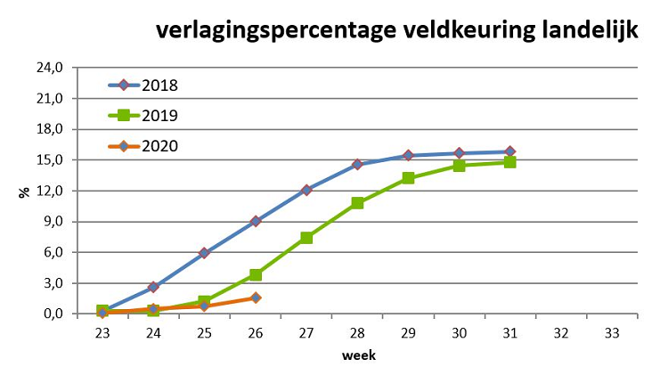 Het verlagingspercentage pootaardappelen in de veldkeuring ligt momenteel op 1,6 procent. Dit is ruim 2% lager dan afgelopen jaar.