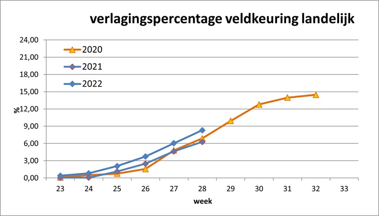 In de grafiek hieronder is het landelijke verlagingspercentage van de veldkeuring te zien in vergelijking met afgelopen jaren.