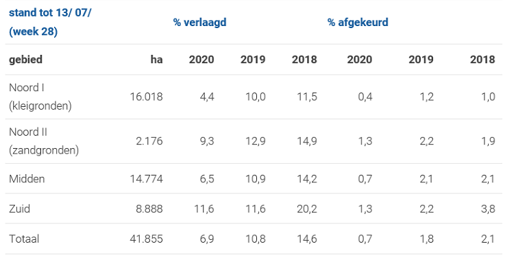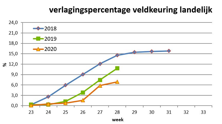 In het veld wordt regelmatig primair waargenomen. 40% van de verlagingen op virus hebben als oorzaak primair. In onderstaande grafiek is het percentage verlagingen en afkeuringen ten opzichte van voorgaande jaren te zien.