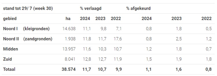 De eerste keuring is nagenoeg afgerond en driekwart van de percelen heeft inmiddels ook al een tweede keuring. Ruim 1.800 percelen hebben inmiddels toestemming voor loofvernietiging. Het landelijke verlagingspercentage is in de afgelopen week uitgekomen op 11,7 procent en ligt nu hoger dan vorig jaar.