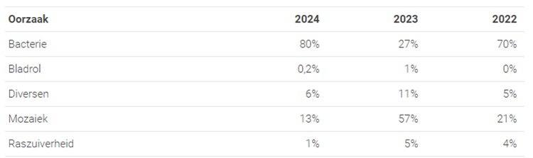 Bacteriën zijn in 80 procent van de gevallen verantwoordelijk voor verlaging. Mozaiek zorgt voor 13 procent. De percentages voor bladrol en overig liggen een stuk lager, met respectievelijk 0,2 en zes procent.