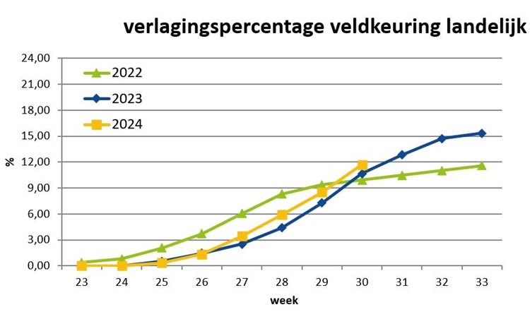 De grafiek hieronder toont het landelijk verloop van het percentage verlagingen van de veldkeuring pootaardappelen in de afgelopen drie jaar.