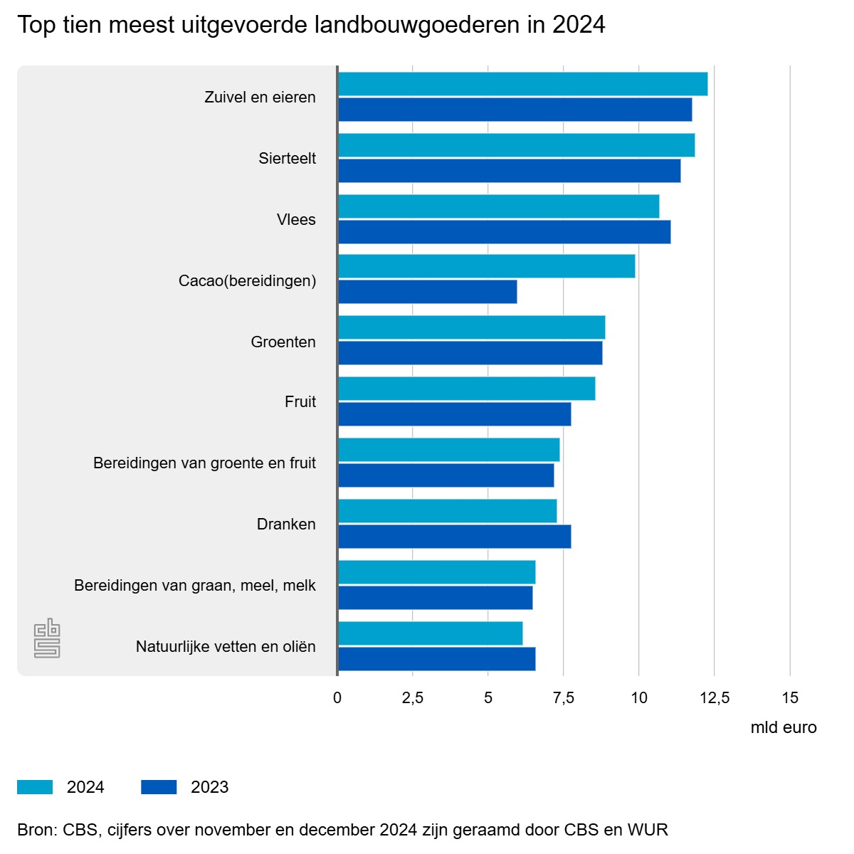 In de ranglijst van meest uitgevoerde landbouwproducten is de top drie in 2024 ten opzichte van 2023 ongewijzigd gebleven, met de export van zuivel en eieren op één, de sierteeltexport op twee, en de vleesexport op drie. De exportwaarde van zuivel en eieren (12,3 miljard euro) en van sierteelt (11,9 miljard euro) is in een jaar tijd met 4 procent toegenomen. De vleesexport nam met 3 procent af, van 11,1 miljard tot 10,7 miljard euro.