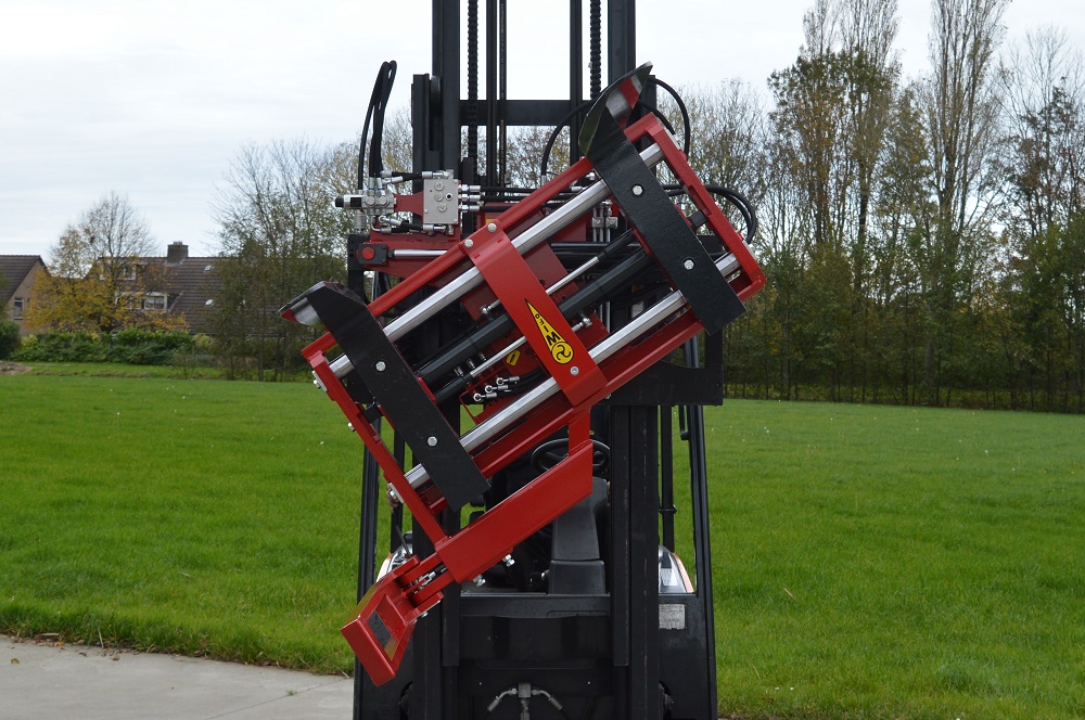 Dit nieuwe type kistenkantelaar is uitgevoerd met een geïntegreerde vorkenversteller en kan je optioneel ook nog combineren met een sideshift. De kantelaar is daarmee de oplossing voor de handling van verschillende type kisten waarbij het nodig is de vorken op verschillende breedtes te plaatsen.