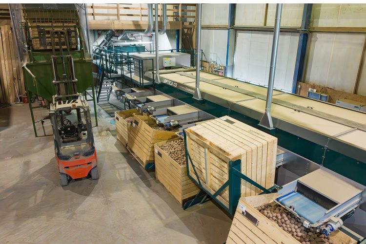 In de sorteerlijn is een mechanische maatsorteerder gecombineerd met een optische kwaliteitssorteerder: de Optica Q (zie hoofdfoto). Het product kan via verschillende routes naar de Optica Q lopen: langs de maatsorteerder direct naar de Optica Q, of via de bufferbunker van 6,5 ton. Los van de maatsorteerder kan het product ook via een aparte bunker of de kistenlossers bij de Optica Q komen. “Partijen met meer grond erop laat ik bijvoorbeeld door de bufferbunker lopen. Andere partijen die makkelijk ‘vellen’, juist niet. Partijen die gevoelig zijn voor barsten, gaan via de kistenlossers, zodat de valhoogte beperkt is. En bijmaten kan ik bijvoorbeeld later pas laten nalezen. Zo kan ik per partij kiezen welke route het meest passend is.”