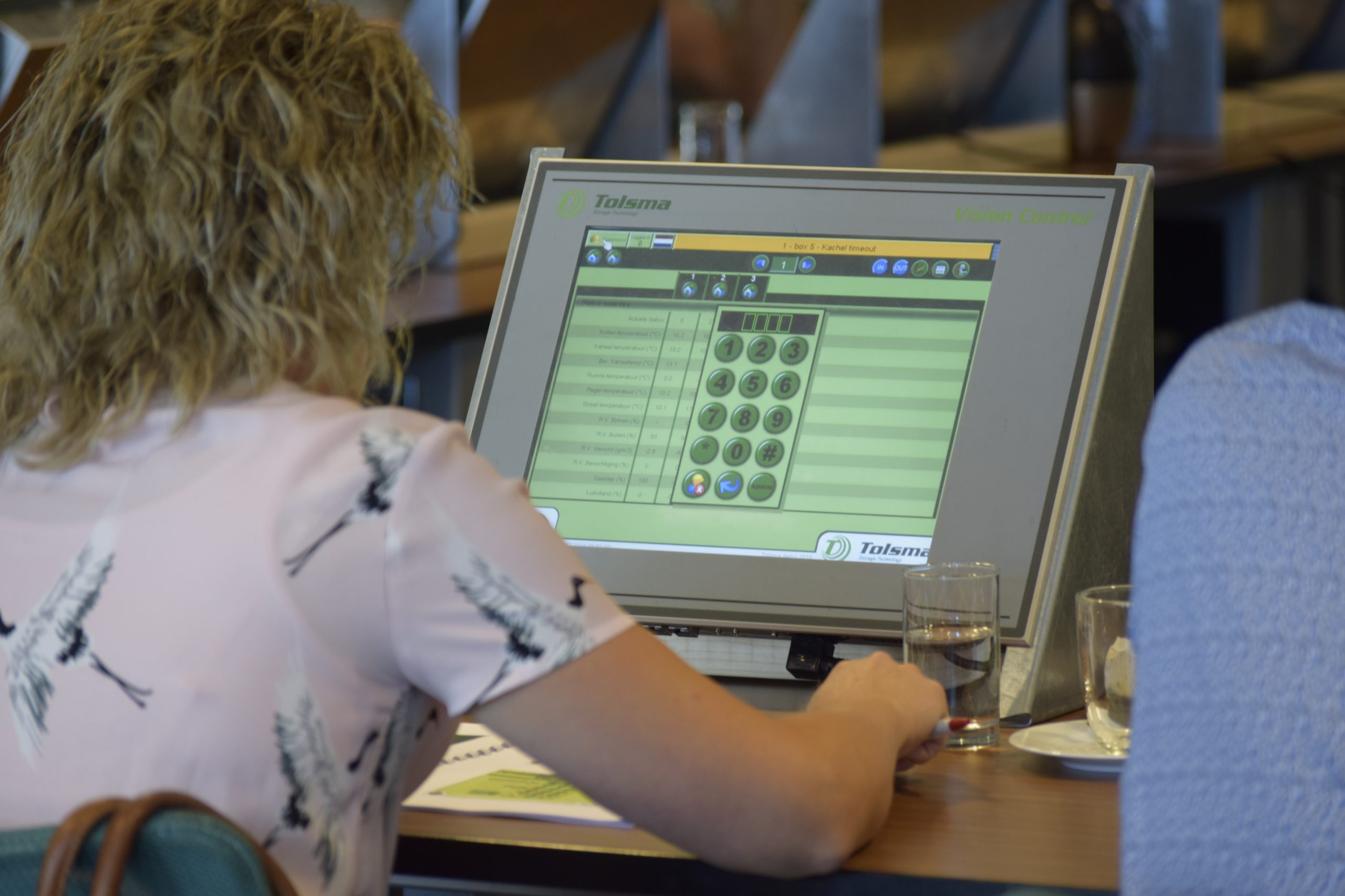 De sessie begon met het doornemen van de menustructuur van de Vision Control, het systeem dat in 2009 de Tolnet heeft vervangen en tot twintig bewaarcellen kan aansturen. Dat varieert van ventilatorenbesturing (inclusief debietregeling), luikenbediening, koeling, warmtestabs tot CO? verversing, kiemremming en energiemanagement. Na deze uitleg konden de telers zelf diverse instellingen voor het drogen van aardappelen en uien uitproberen via het demoscherm. Op dat scherm worden zowel schematische als grafische weergaves getoond van de bewaarcyclus, waardoor afwijkingen sneller zichtbaar worden. Om de verschillen tussen diverse bewaarseizoenen te tonen wordt van elk seizoen een separaat tabblad aangemaakt waarin alle instellingen, temperatuurwaardes, draaigegevens en alarmen worden vermeld.