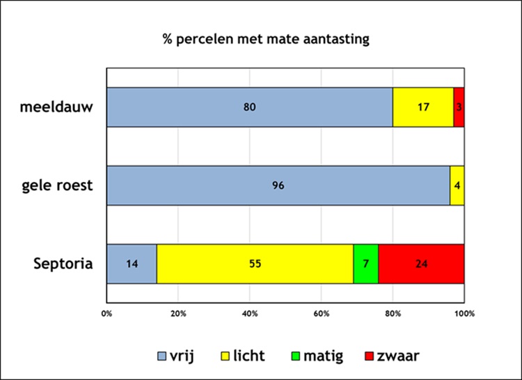 Op ruim 85 procent van de percelen is Septoria gevonden. In de meeste gevallen gaat het dan om Septoria onderin het gewas op de oudere bladeren. Echter, een duidelijk verschil ten opzichte van voorgaande jaren is dat in veel meer percelen ook vlekjes op de jongere bladeren worden gevonden. Zelfs in een enkel geval al op het jongste blad.