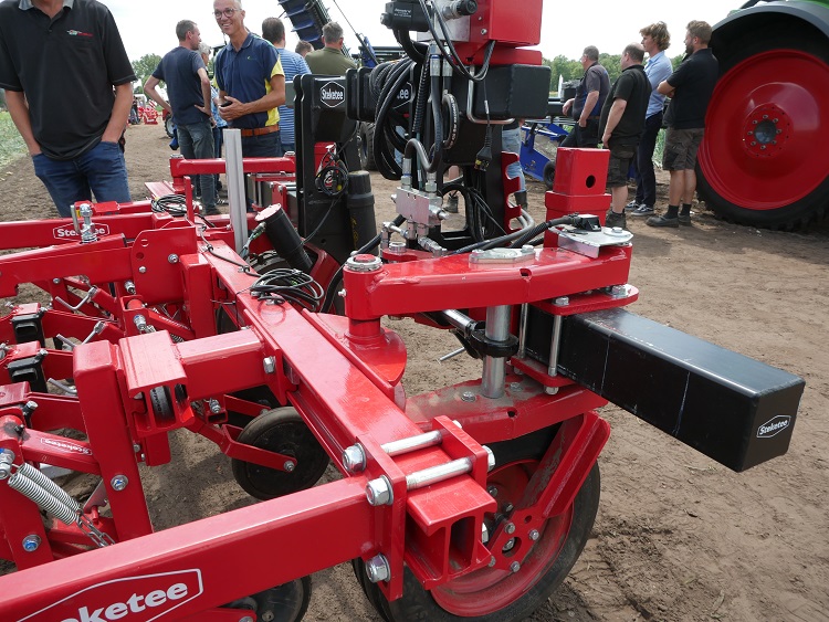 Steketee benadrukt bij monde van Hans Hoogland het belang van zo vroeg mogelijk starten met het schoffelen. Voor iedere gewasfase heeft de leverancier de benodigde uitrustingsstukken. Diverse beitelsoorten, torsieweeders, hoekmessen die al dan niet gecombineerd zijn met schijven. Waarmee ook de kwetsbare beginnende uienplant goed beschermd is. Daarnaast zijn er diverse mogelijkheden voor werking in de rij met vingerwieders en borstels. Steketee heeft een nieuwe infrarood camera op de sturing. Die werkt goed, behalve s’ nachts. Afwijkend bij Steketee is dat de schoffelbalk zelf in parallellogram is gemonteerd aan de werktuigdrager. De schoffelbalk beweegt dus horizontaal en niet de aanbouwbok zelf, waardoor de bijsturing van de schoffel directer en sneller is.