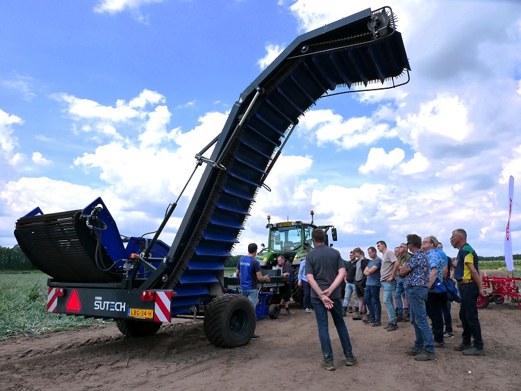 Wouter Schoot Uiterkamp geeft uitleg over de SU-Tech uienladers. Lichte, wendbare oprapers die volledig hydraulisch aangedreven zijn. Alle instellingen zijn op de terminal in de cabine bij te sturen. De brede afvoerband geeft een capaciteit van 120 ton per uur. Door het lage gewicht is er geen beremmingsplicht voor de oplader. Door de montage van een in eigen huis ontwikkelde wielnaaf is een korte draaicircel gerealiseerd. De machine is standaard uitgerust met een egelband en is ook verkrijgbaar met een doorvalmat voor percelen met veel grof onkruid zoals haagwinde of melde. De getoonde machine is de week ervoor in actie geweest bij het in kisten rijden van de winterzaaiuien van Derikx.