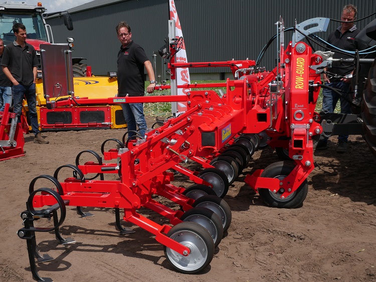 Ralph Aerts van Rovadi geeft tekst en uitleg bij de Einbock schoffelmachine. Deze is op maat gemaakt voor de klant voor drie bedden op 1,50 meter breedte. Opvallend is de korte ophanging van de schoffelbalk aan de automatische stuurbok voor camerabesturing, de Einbock Rowguard. De sideshift kenmerkt zicht door een fijngevoelige en geleidelijke werking. De camera werkt met 2D en 3D beeldherkenning voor een zeer precieze werking.