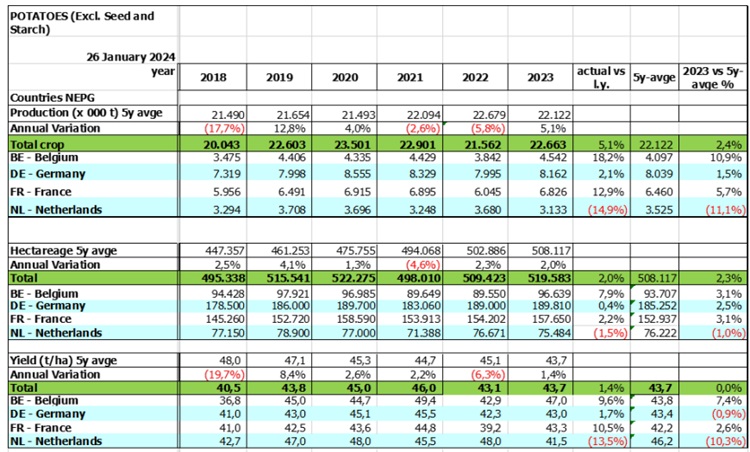 De mondiale oogst in 2023 bedroeg 22,7 miljoen ton, dit is 5,1 procent meer dan in 2022 en bijna gelijk aan het vijfjarig gemiddelde. De teelt van aardappelen vond in 2023 plaats op een totale oppervlakte van 519.583 hectare, dit is een stijging van twee procent ten opzichte van 2022. De gemiddelde opgeslagen opbrengsten in de NEPG-zone bedroegen 43,7 ton per hectare, 1,4 procent hoger dan in 2022.
