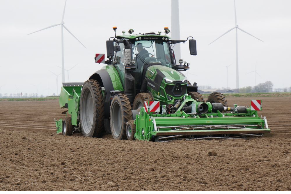 Dankzij een perceel lichte ‘ruilgrond’ kon Rick Meijer uit Dronten afgelopen week al zijn nieuwe Deutz-Fahr 7250 TTV Warrior aanspannen voor de pootmachine en achter de volveldfrees. Het geheel leverde een fraai plaatje op tegen de achtergrond van de grijze bewolking.