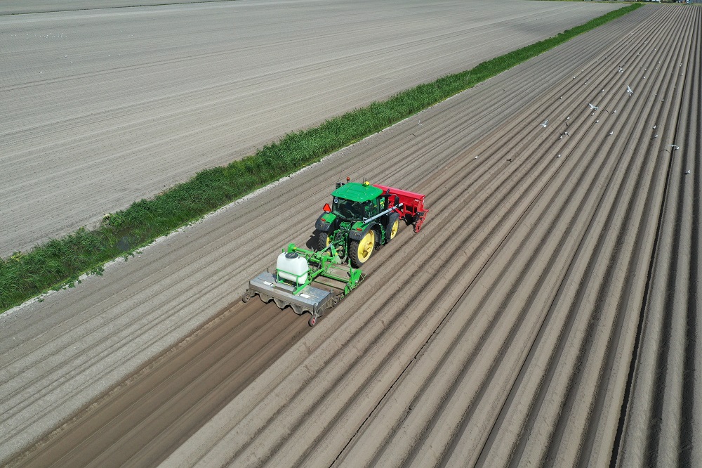De Loof-Does wordt op het bedrijf van Pluister-Wonder dus als een multifunctionele machine in gezet. Het bedrijf had geen rijenspuit op de plantmachine. Hij besloot daar de Loof-Does voor in te zetten, voorop tijdens het land klaar maken. “We waren op zoek naar een toediening van Moncereen, later werd het Amistar, voor het poten. Dat was de reden dat we op de Loof-Does stuitten. Die hebben we op zo’n manier aangepast, dat die op een goede manier toegediend kon worden”, vertelt Pieter Pluister, “Ja, dan heb je de Loof-Does staan toen hebben we besloten om de machine ook in combinatie met de rijenfrees te gebruiken om op die manier de onkruidbestrijding uit te voeren.”